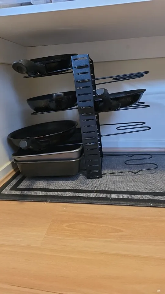 Designed to hold pots, pans, lids, bakeware and more — without drilling or damaging your cabinets.